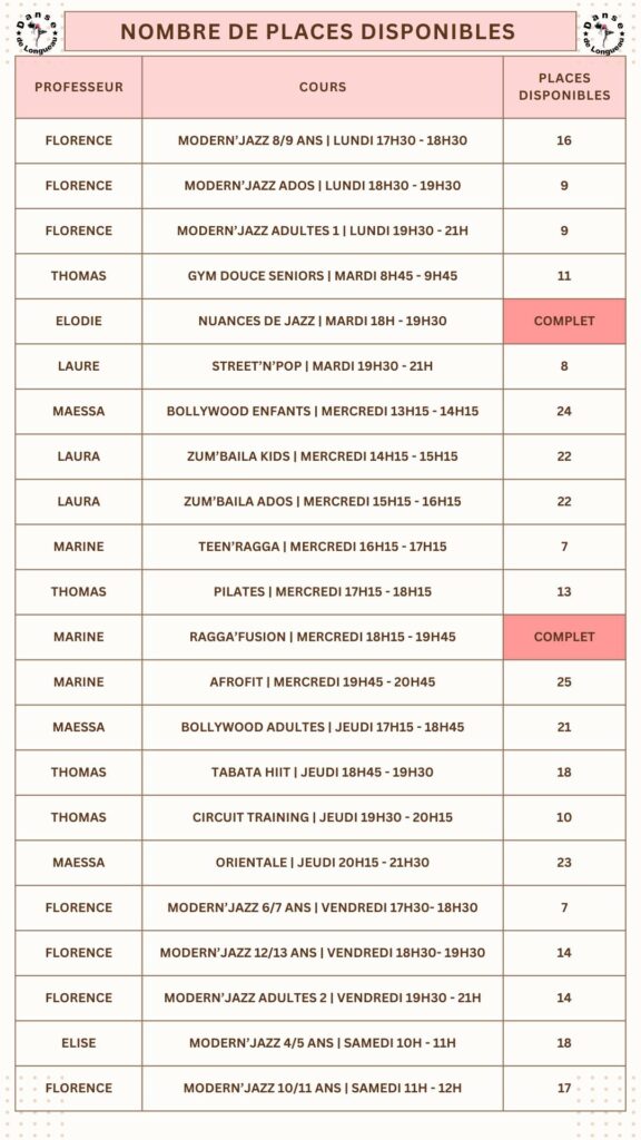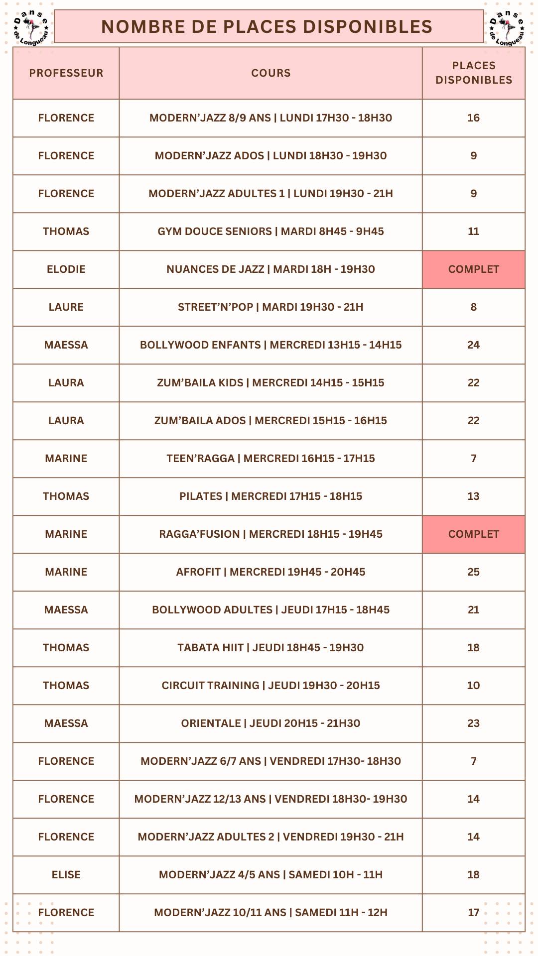 Comme prévu, les permanences d’inscriptions de nos pré-inscrits étant close, il est temps pour nous de vous dévoiler le tableau récapitulatif du nombre définitif de places disponibles dans chacun de nos cours. 📑